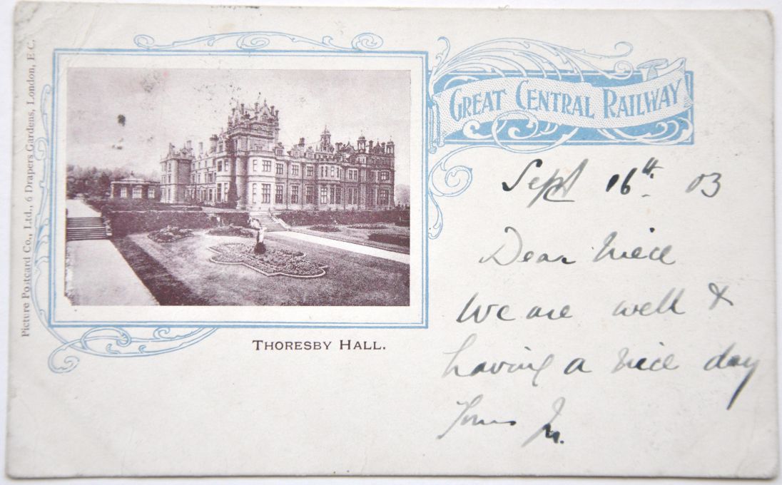 | Lot 549 | Category: PostcardsGCR official card "Thoresby Hall" (GC110) showing sepia photo within blue frame. Published by PPC, UB, postally used 1903. £20 |