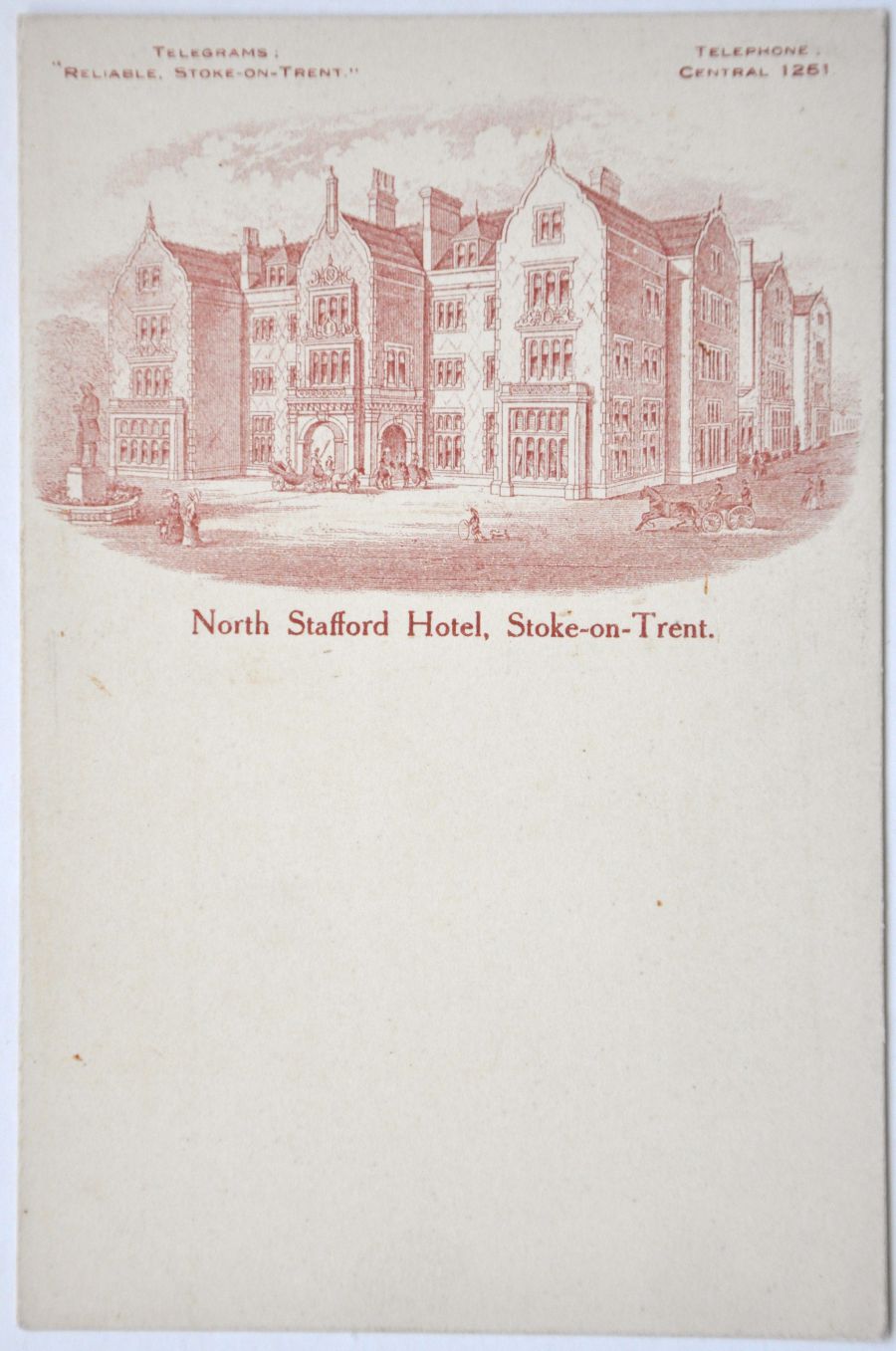 Category: PostcardsNSR official "North Stafford Hotel, Stoke on Trent" (NS160) showing brown coloured vignette half view of hotel exterior. Not postally used. £12 | |