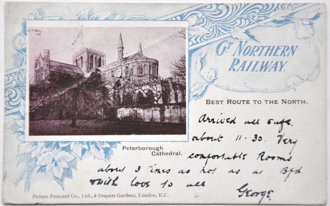 | Lot 558 | Category: PostcardsGNR early intermediate size official card "Peterborough Cathedral" (GN176). Blue frame, UB, printed by PPC. Postally used 1900. Large corner crease. £10 |