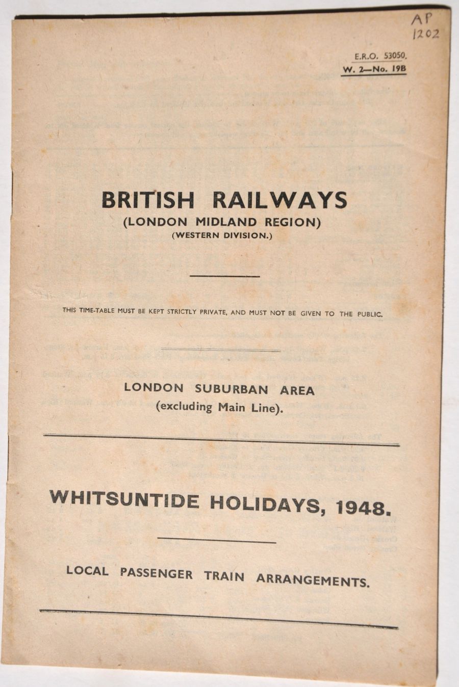 Category: Working InstructionsBR(M) Western Division booklet of London Suburban Area (excluding main line) Whitsuntide Holidays 1948 local passenger train arrangements. 32pp. £10 | |