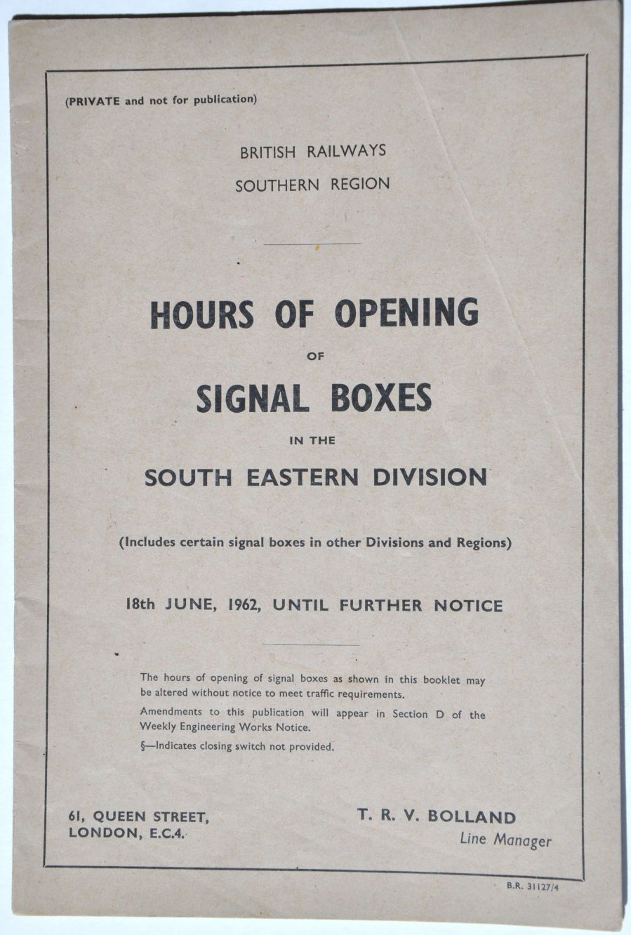 Category: Working InstructionsBR(S) booklet "Hours of Opening of Signal Boxes in the South Eastern Division". 23pp dated June 1962. £10 | |