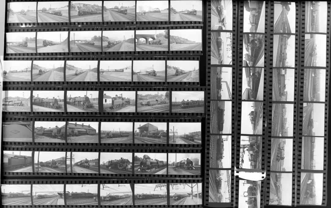 | Lot 695 | Category: Photographic NegativesAPPROX 80 35mm B&W negatives in strips showing steam locos from various regions in the 1950s. Appear reasonable quality. (80) £10 |