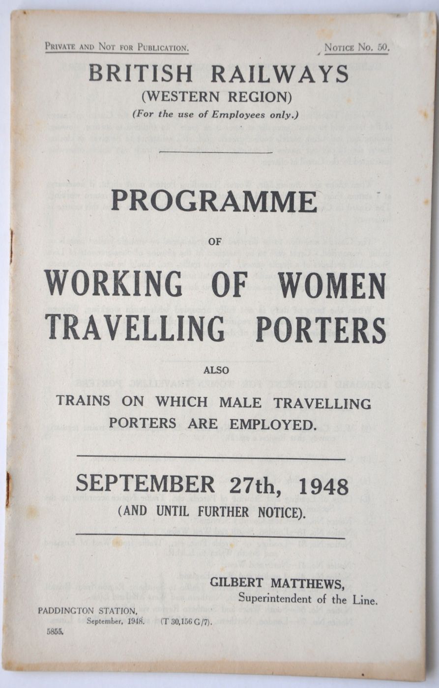 Category: Working InstructionsBR(W) notice No.50 "Programme of Working of Women Travelling Porters also trains on which Male Travelling Porters are employed". 34pp dated September 1948. £10 | |