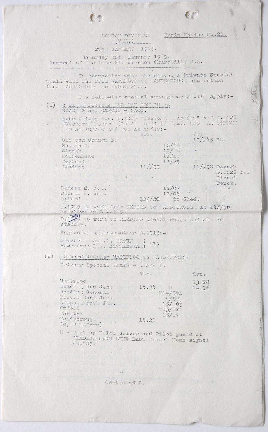 Category: Working InstructionsBR(W) typescript train notice No.26 re arrangements and engine workings for the funeral train of Sir Winston Churchill. 8 pages dated 27th January 1965. £10 | |