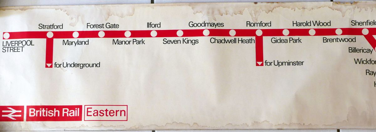 | Lot 723 | Category: Carriage Prints (not framed)BR(E) route diagram for lines from Liverpool Street to Southend and Witham. Circa late 1970s. Approx 44" x 10", damp staining to edges. £10 |