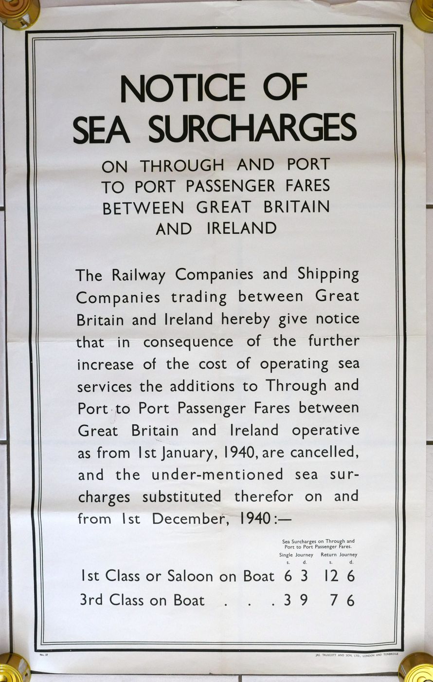 Category: PostersBIG 4 published d/r letterpress poster "Notice of Sea Surcharges" re charges for journeys between Britain and Ireland. Dated December 1940. Plus another similar. (2) £10 | |
