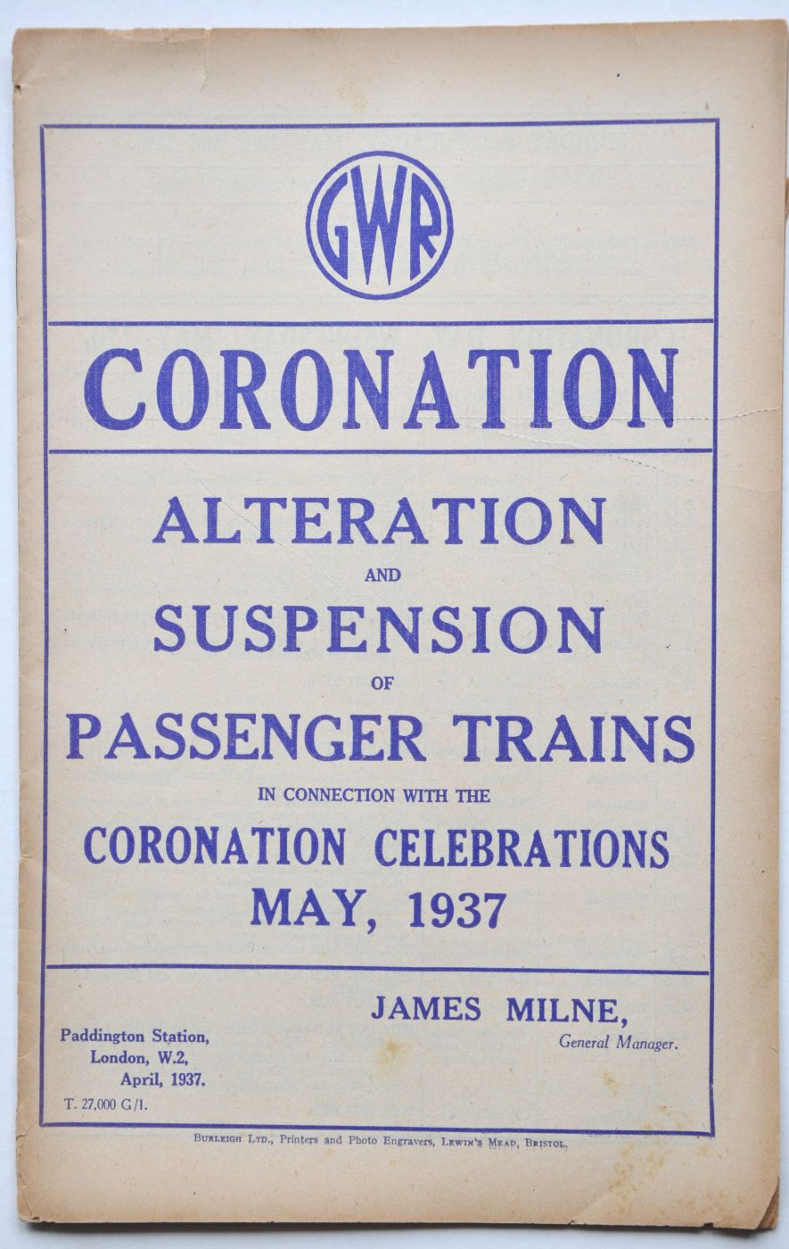 Category: Working InstructionsGWR 24pp handbill type leaflet "Coronation - Alteration and Suspension of Passenger Trains in connection with the Coronation Celebrations, May 1937". Blue print. £10 | |