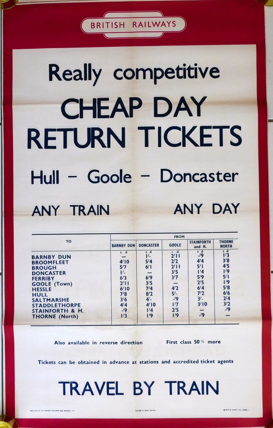 Category: PostersBR(NE) d/r poster "Really Competitive Cheap Day Return Tickets Hull - Goole - Doncaster". Shows fares to various stations in the area. Dated 1953. Folded, discolouration at folds. Plus another similar. (2) £10 | |