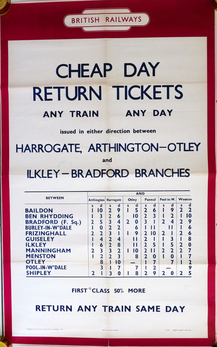 Category: PostersBR(NE) d/r poster "Really Competitive Cheap Day Return Tickets Harrogate, Arthington - Otley, Ilkley - Bradford branches". Shows fares to various stations in the area. Dated 1952. Folded, discolouration at folds. £10 | |