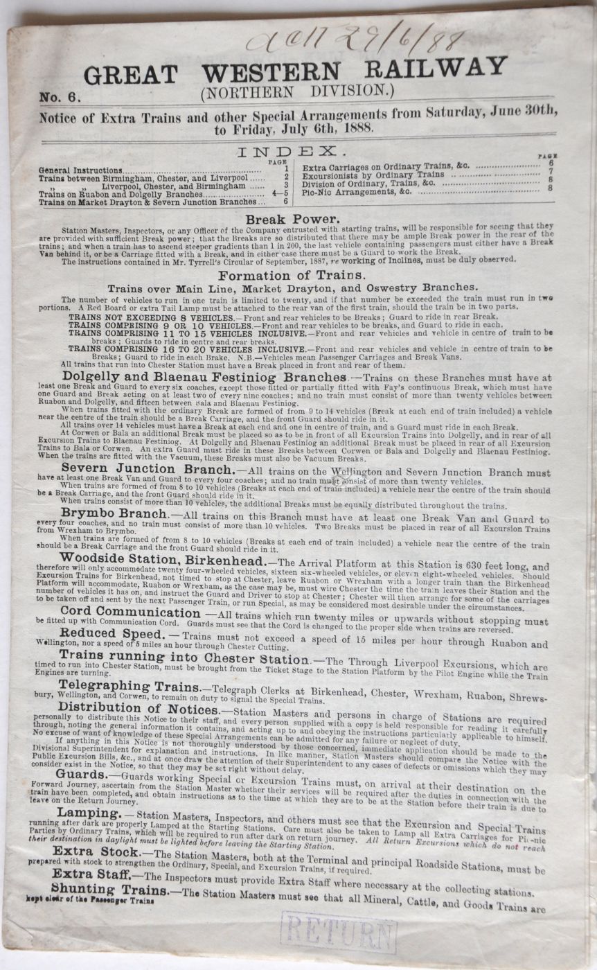 Category: Working InstructionsGWR Northern Division "Notice of Extra Trains and other special arrangements". 8pp dated July 6th 1888. £10 | |