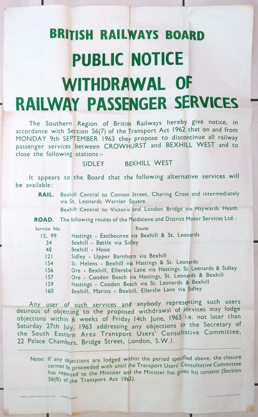 Category: PostersBR(S) d/r letterpress poster re the proposed withdrawal of passenger services between Crowhurst and Bexhill West and closure of Sidley and Bexhill West stations. Green print, dated September 1963. Folded. £10 | |