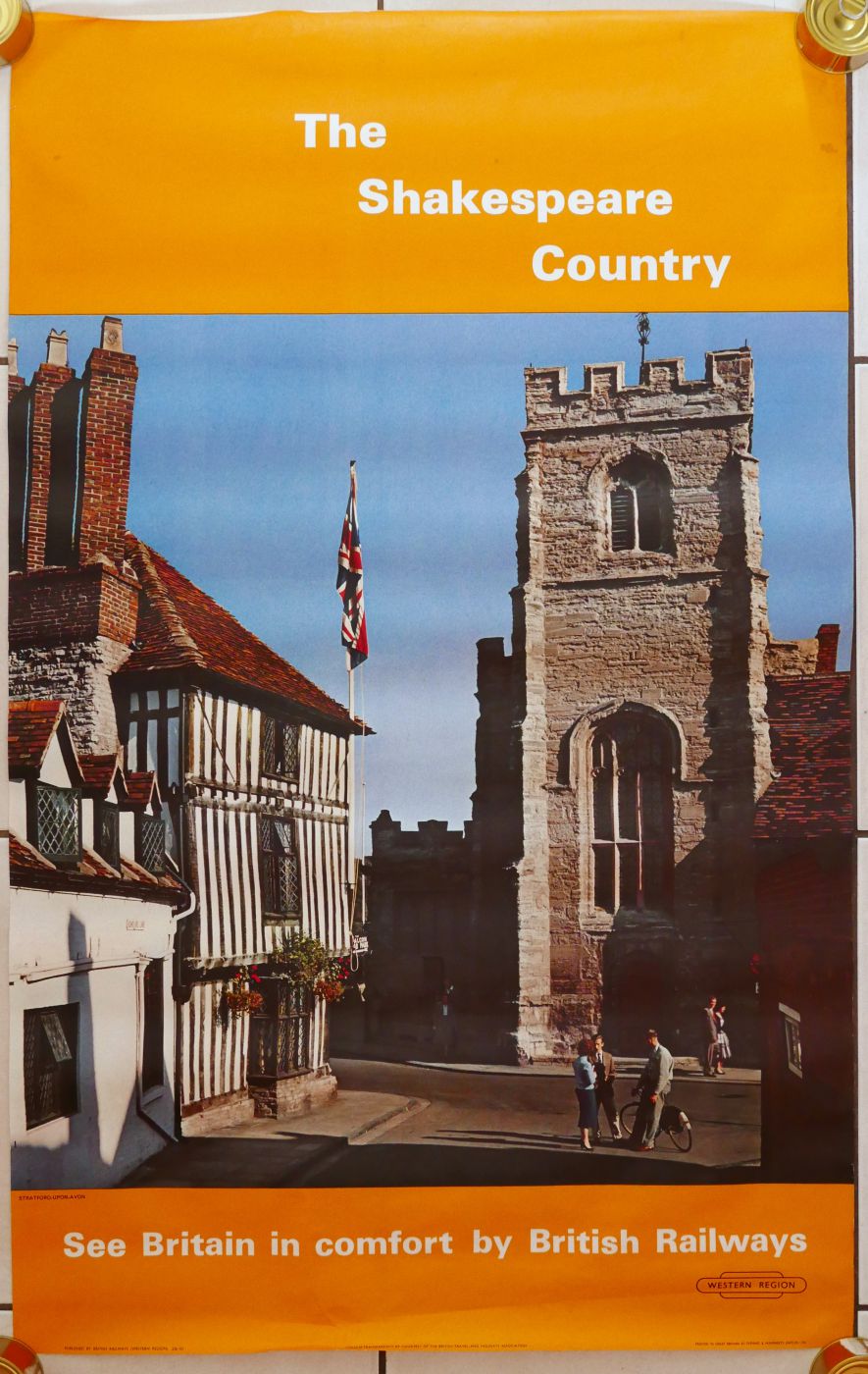 Category: PostersBR(W) d/r colour photographic poster "The Shakespeare Country" showing view of Stratford upon Avon. Dated 1962. Folded and worn. £10 | |