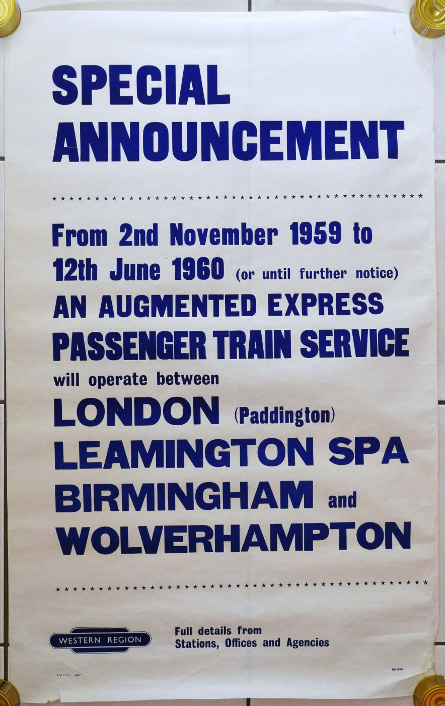 Category: PostersBR(W) d/r letterpress poster announcing the "Augmented Express Passenger Service - Paddington, Leamington Spa, Birmingham and Wolverhampton". Blue print, dated November 1959. £10 | |