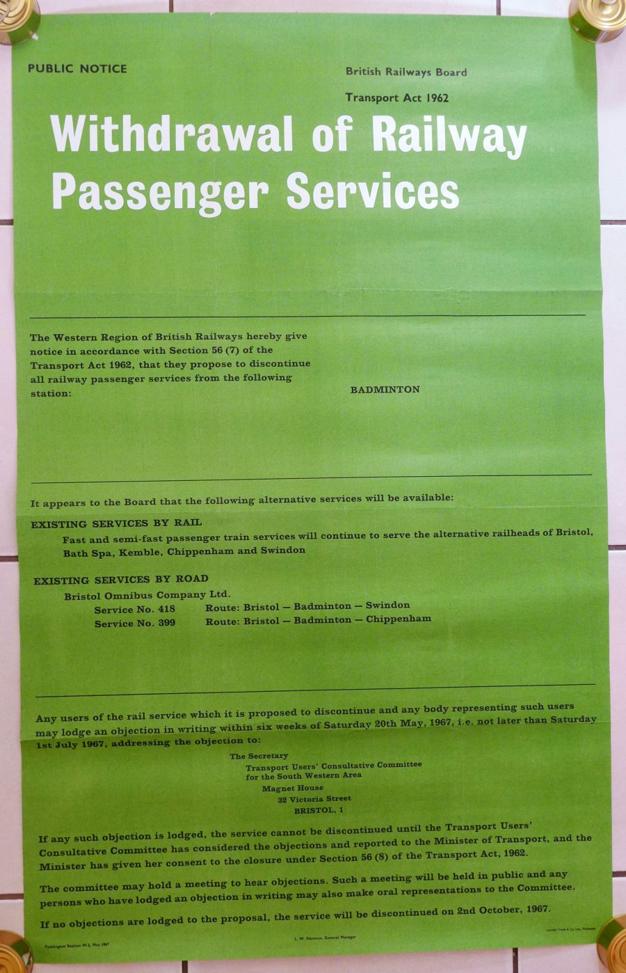 Category: PostersBR(W) d/r letterpress poster re the withdrawal of passenger services from Badminton station. Green and black print, dated 1967. Folded. £10 | |