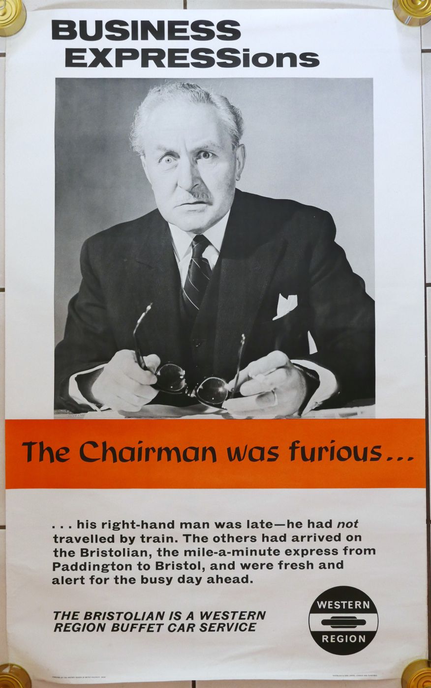 Category: PostersBR(W) d/r photographic poster "Business Expressions" showing worried chairman and advertising the Bristolean named train. Dated 1962. Slight edge creasing. £10 | |