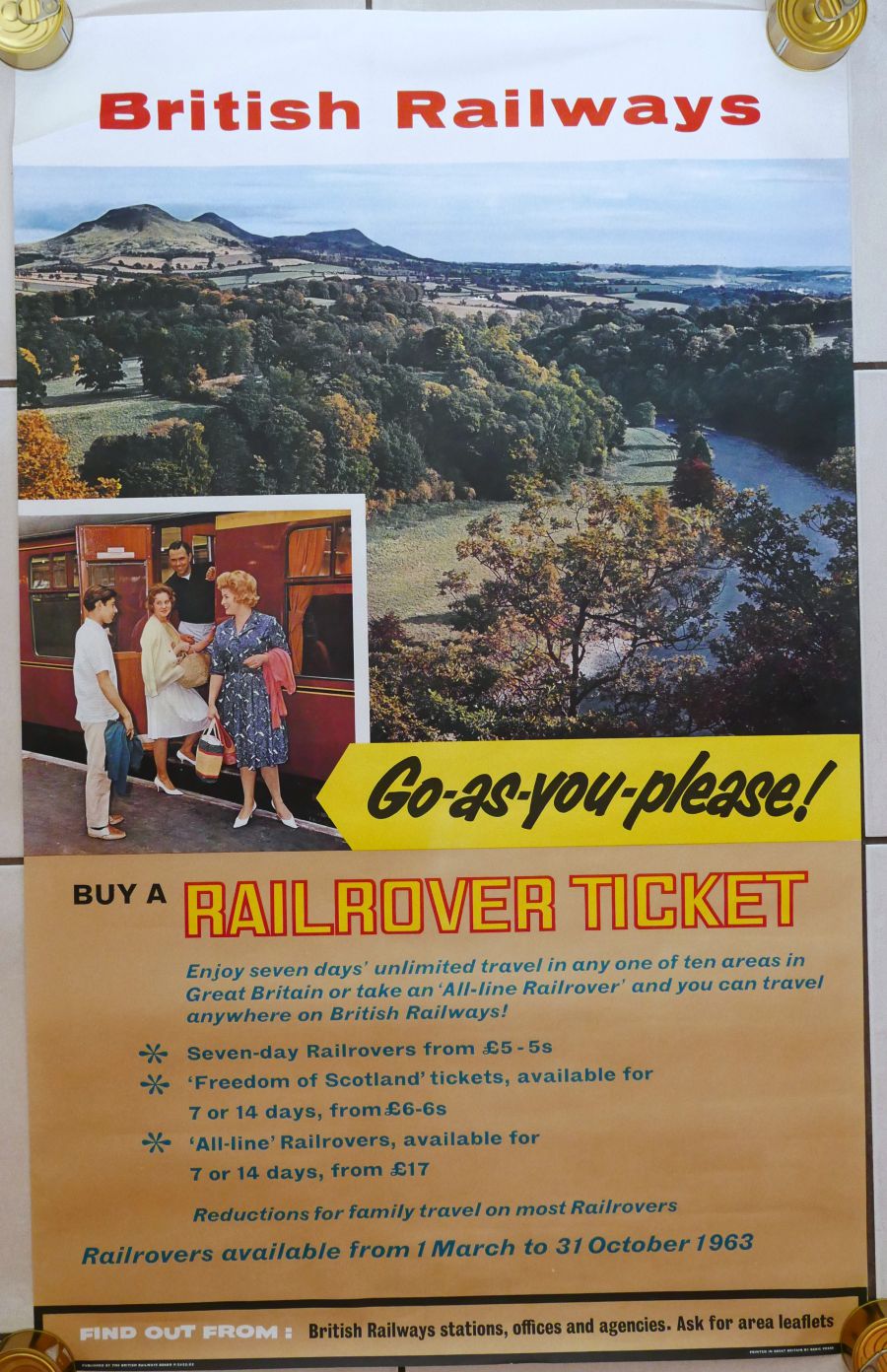 Category: PostersBRB d/r coloured photographic poster "Go as you Please - Buy a Railrover Ticket" showing scenic view and family boarding train. Dated 1963. £10 | |