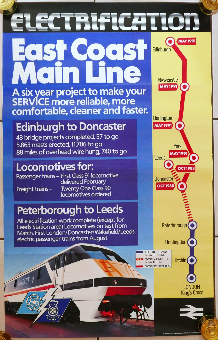 Category: PostersBRB d/r coloured photographic poster advertising progress in the ECML electrification north of Peterborough showing map and new class 91 locos. Dated 1988. Folded. £10 | |