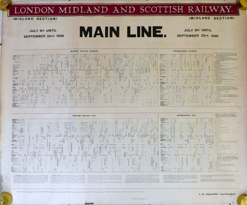 | Lot 790 | Category: PostersLMS Midland Section q/r timetable poster of main line services between London and Edinburgh. Red and black print, dated July 1929. Tears and wear to edges, slight corner loss. £10 |