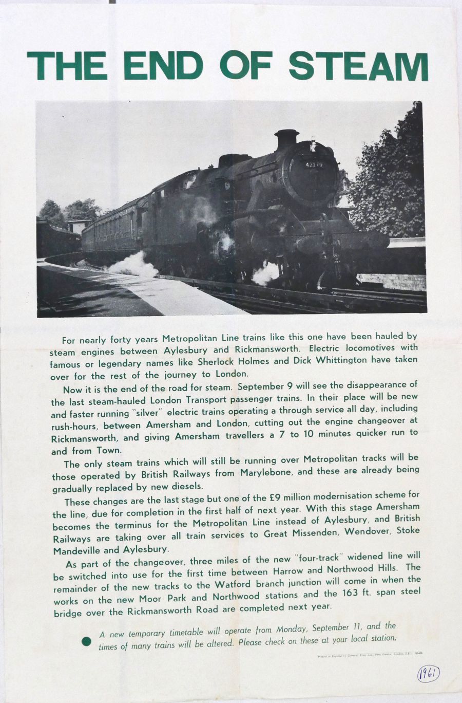 Category: PostersLONDON TRANSPORT 30" x 20" photo illustrated poster "The End of Steam" announcing the end of steam haulage on the Metropolitan Line between Aylesbury and Ricksmanworth. Annotated date shows 1961. Folded. £10 | |