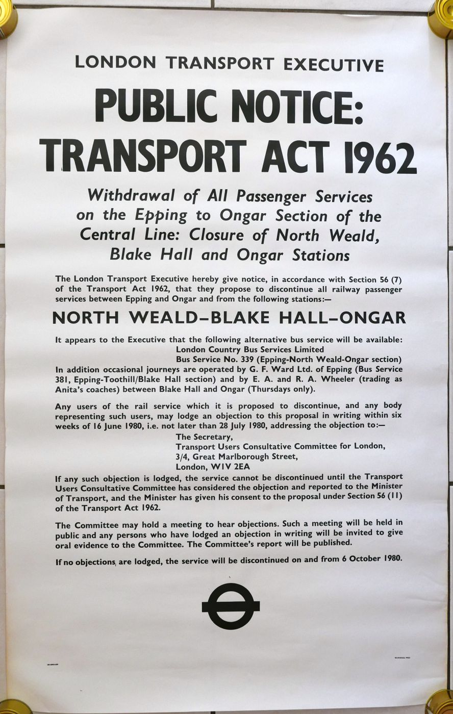 Category: PostersLONDON TRANSPORT EXECUTIVE d/r letterpress poster re the withdrawal of passenger services on the Epping to Ongar section of the Central Line. Dated 1980. £10 | |