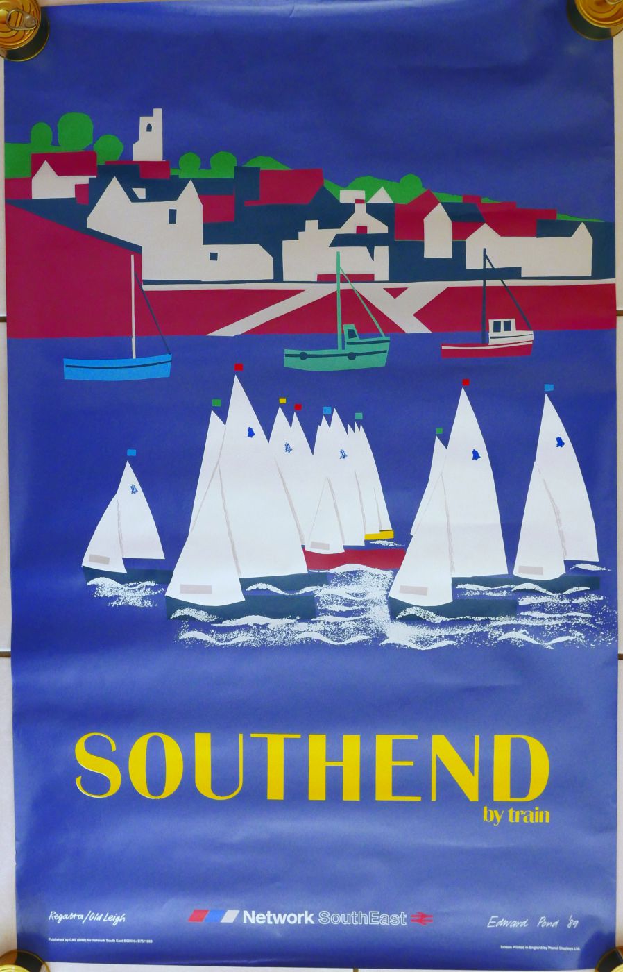 Category: PostersNETWORK SOUTH EAST d/r pictorial poster "Southend by Train" showing coloured view of the regatta at Old Leigh by Edward Pond. Dated 1989. £10 | |
