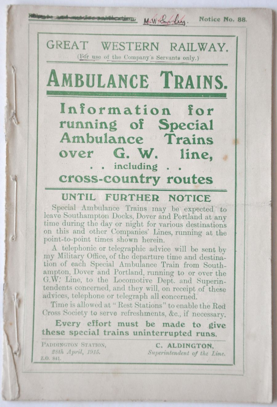 Category: Working InstructionsGWR notice No.88 "Ambulance Trains. Information for running of special ambulance trains over GW line including cross country routes". Green print, 14pp dated April 1915. £10 | |