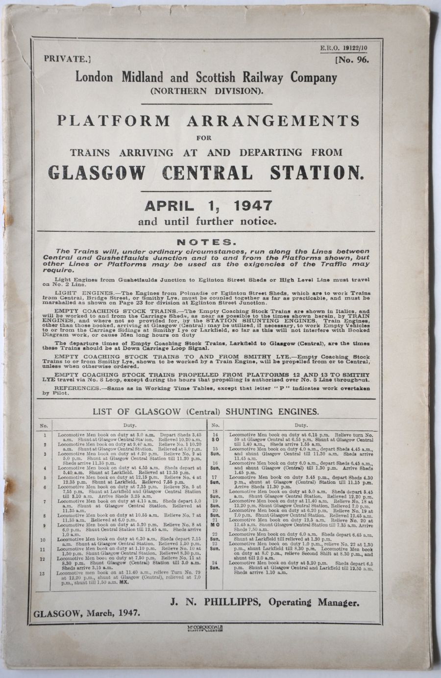 Category: Working InstructionsLMS Northern Division "Platform Arrangements for Trains Arriving and Departing from Glasgow Central Station". Foolscap sized, 23pp dated April 1947. Covers detached at rusty staples. £10 | |