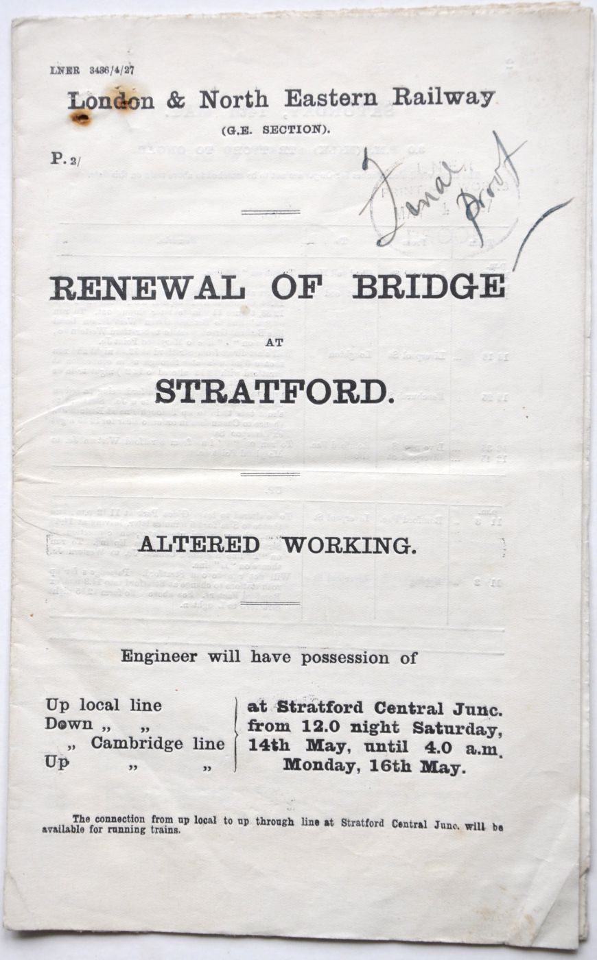 Category: Working InstructionsLNER GE Section notice "Renewal of Bridge at Stratford - altered working". 15pp dated May 1927. £10 | |