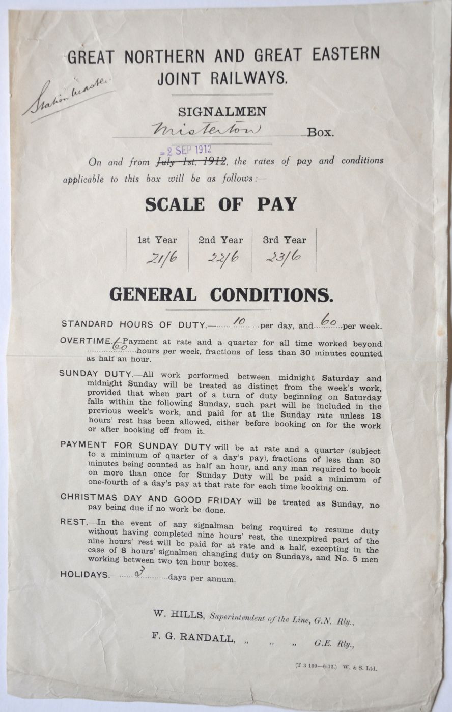 Category: Signalling PaperworkGN&GE JOINT RAILWAYS 1pp foolscap sized notice listing the rates of pay for signalmen working at Misterton signalbox. Dated 1912. Slightly creased. £10 | |