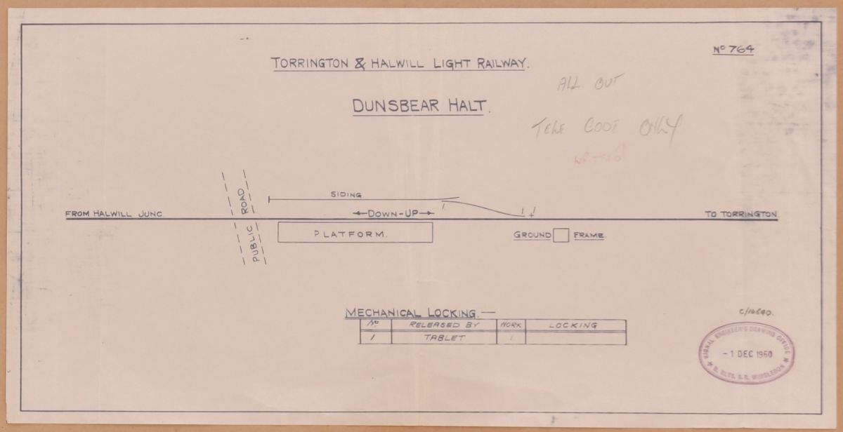| Lot 1196 | Category: Signal Box DiagramsTorrington and Halwill Light Railway, Dunsbear Halt, 1960, office copy. |