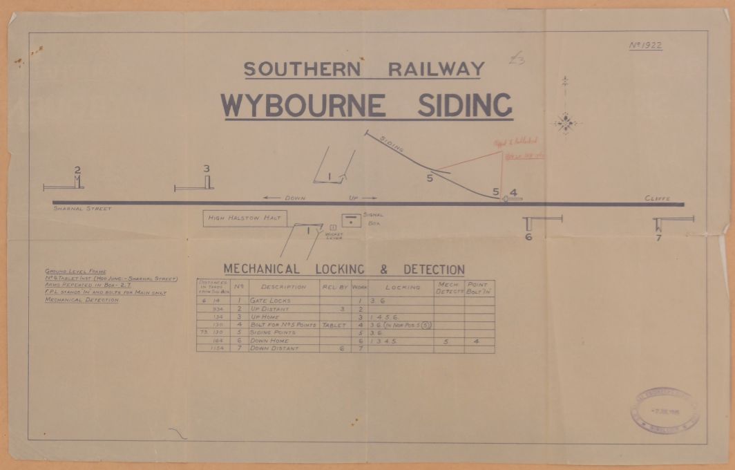 | Lot 1218 | Category: Signal Box DiagramsSR signal box diagram, Wybourne Siding, office copy, 1945, shows High Halstow Halt, approximately 24"x15". |