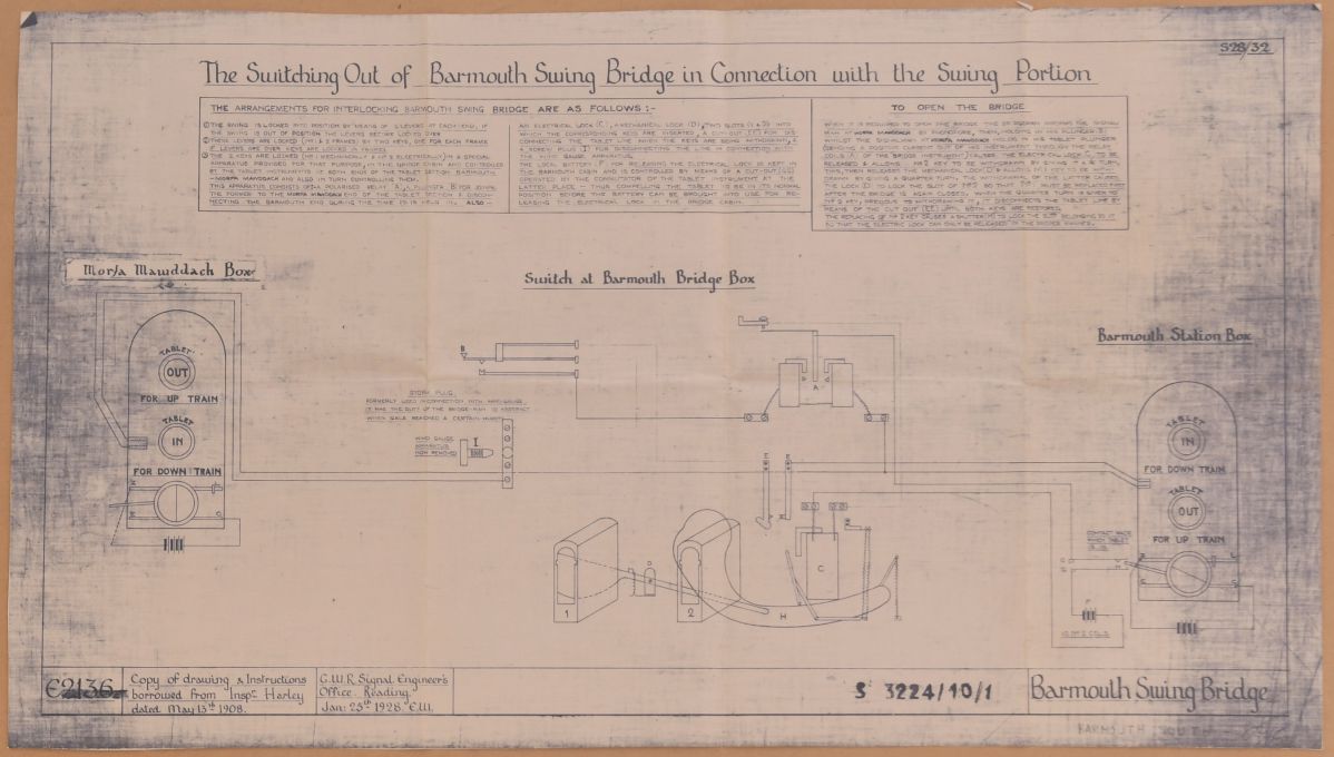 | Lot 1228 | Category: Signalling PaperworkGWR/Cambrian plans and instructions re opening of Barmouth Swing Bridge and switching out, dieline drawing, GWR 1928, referring to Cambrian 1908 and later updated to show renaming of Barmouth Junction to Morfa Mawddach, approximately 28"x16". |