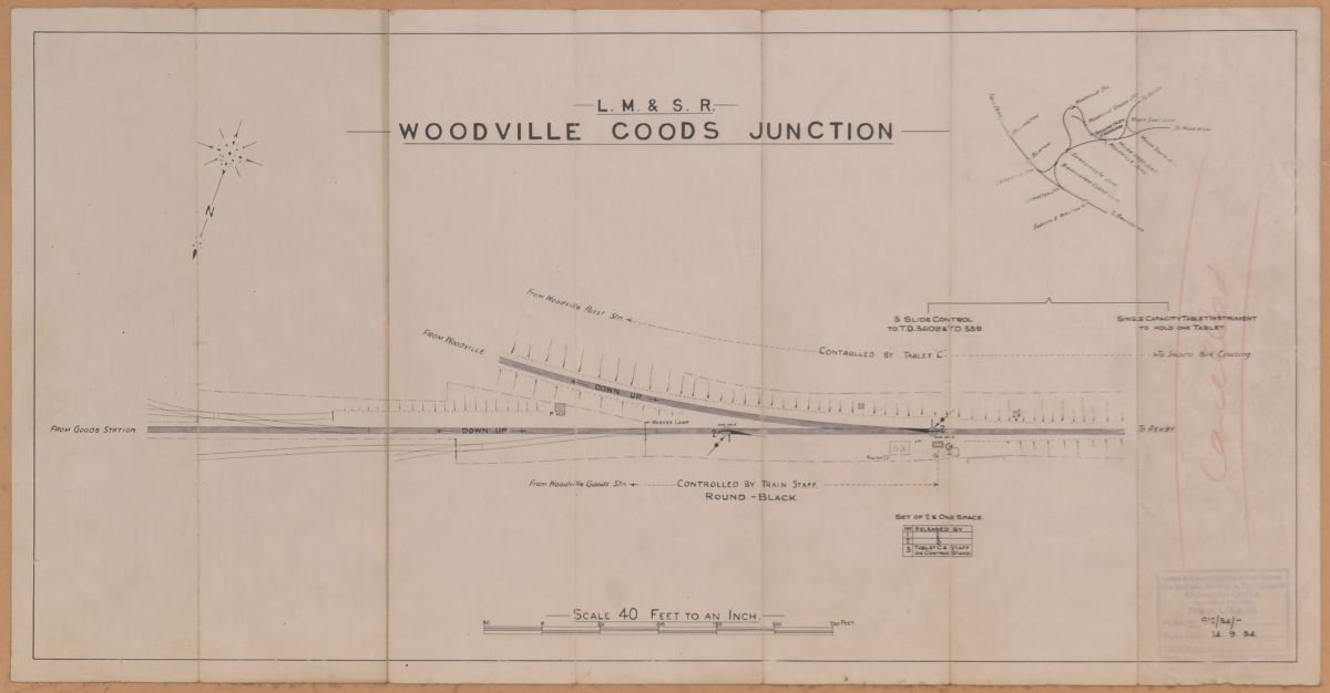 | Lot 1249 | Category: Signalling PaperworkLMS, Woodville Goods Junction, 1934 S&T plans showing staff and tablet arrangements, approximately 28"x15". |
