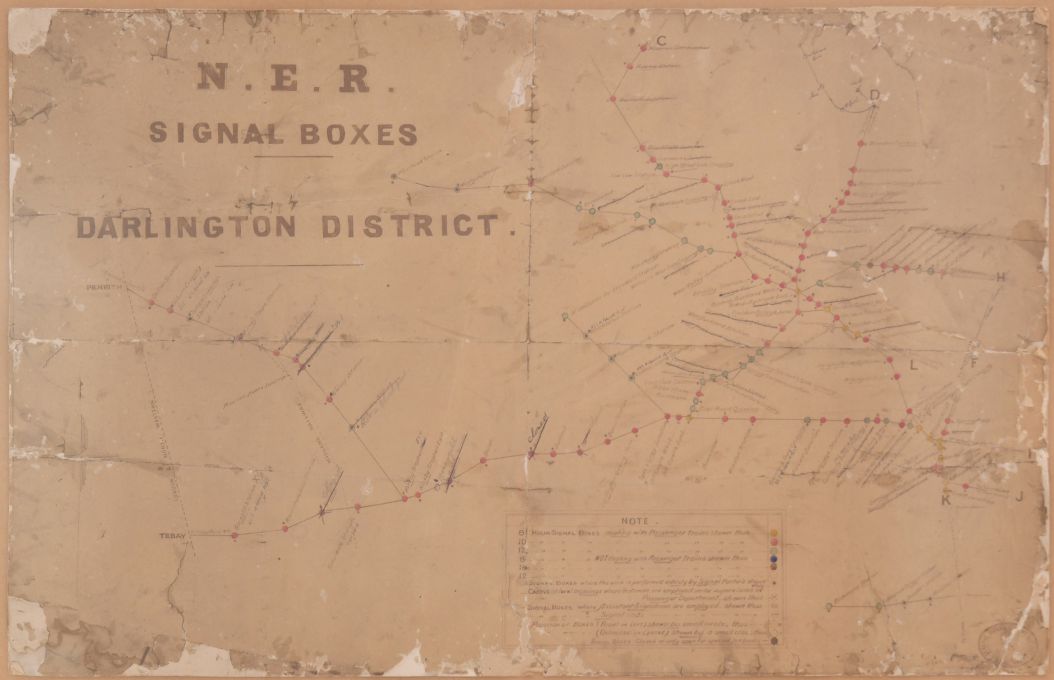 | Lot 1266 | Category: Signalling PaperworkNER Signal Boxes, Darlington District, map mounted on card though in very poor condition, however the information is complete and legible. |