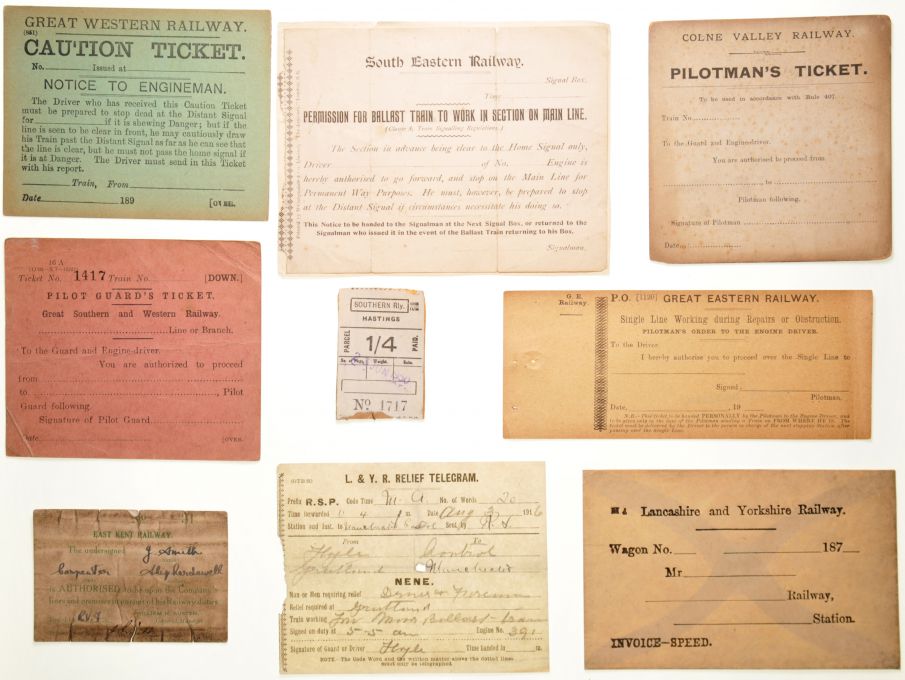 | Lot 1311 | Category: PaperworkEast Kent Railway, Authorisation Card to be on the railway premises, J Smith, carpenter, Shepherdswell, well used; Colne Valley Railway, pilotman's ticket, unused; SER ballast train permit; and a quantity of other forms relating to single line working, etc. (25) |