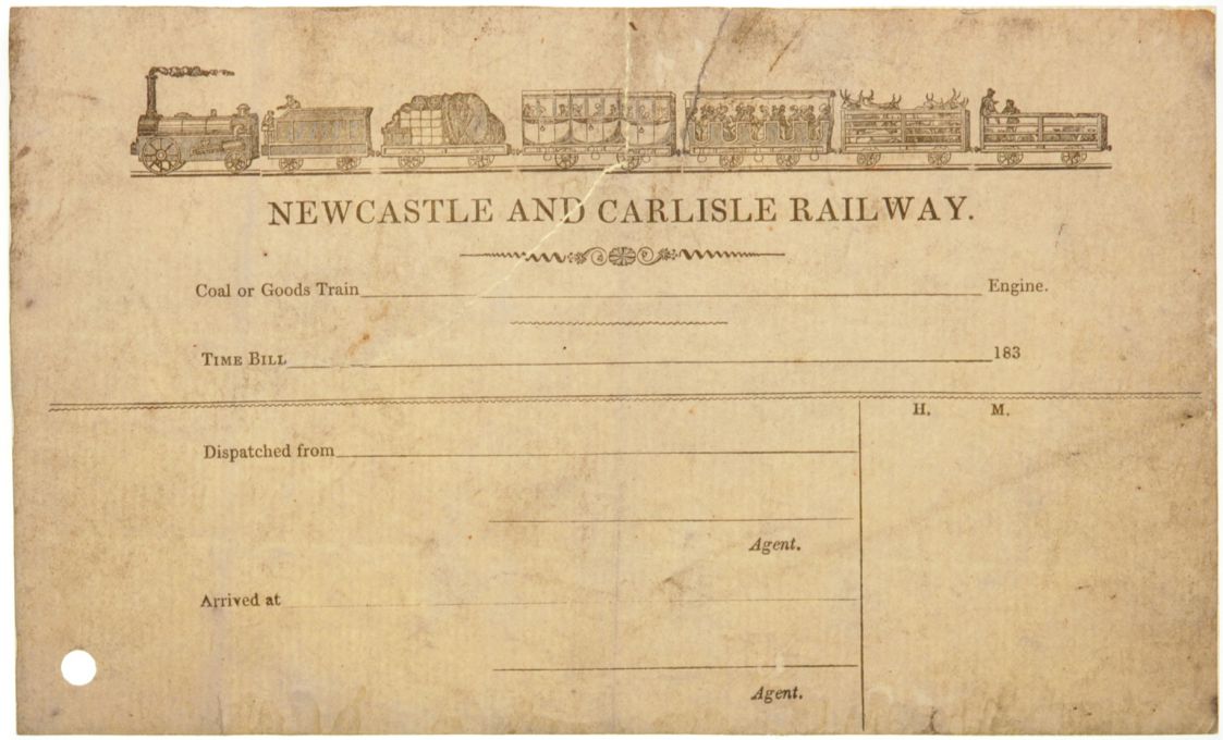 | Lot 1341 | Category: PaperworkNewcastle and Carlisle Railway, Coal or Goods Train Time Bill, dated 183_, vignette of an early train at the top, rather dusty. |