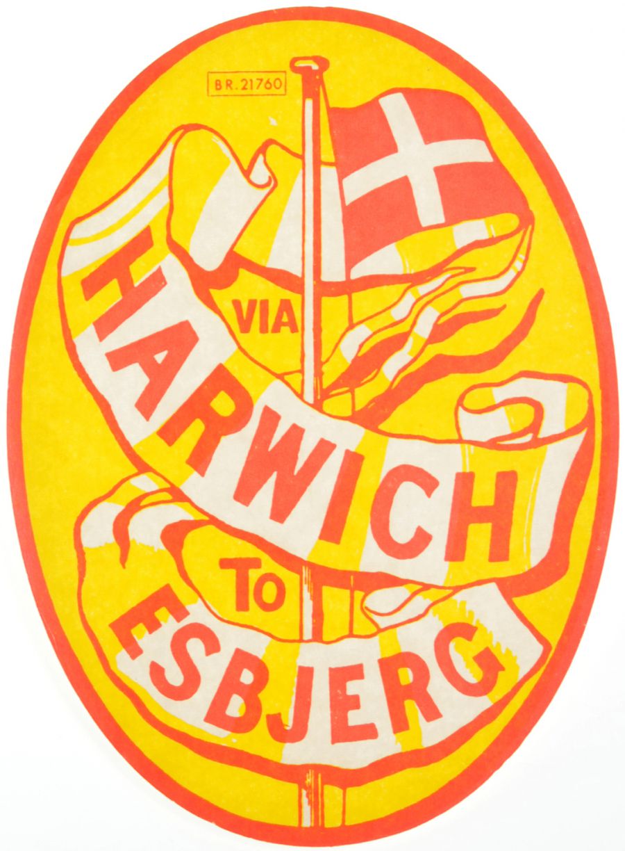 Category: Luggage LabelsBR, Via Harwich To Esbjerg, scroll and flag design. | |