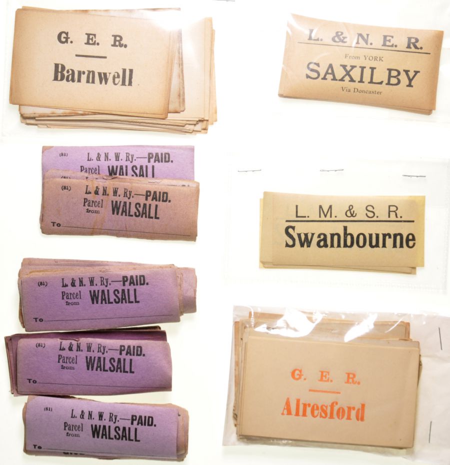 Category: Luggage LabelsLNWR, LMS, GER, (LNWR parcel labels stuck together). Quantity with duplications. | |