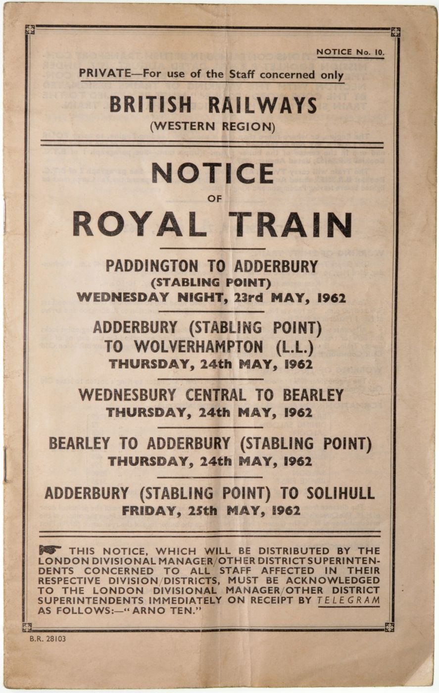 Category: Royal Train NoticesBR(W), Paddington-Adderbury, thence Wolverhampton, etc, 23-25th May 1962, loco 4082, with letter to driver Price, Stafford Road, 28pp, used condition. | |