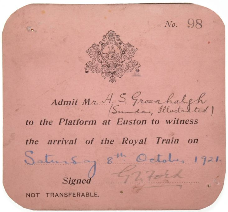 | Lot 149 | Category: Royal Train NoticesLNWR, admission ticket to platform at Euston for the arrival of the Royal Train, 8th October 1921, large card, with marks, paper on the back, as removed from album. |