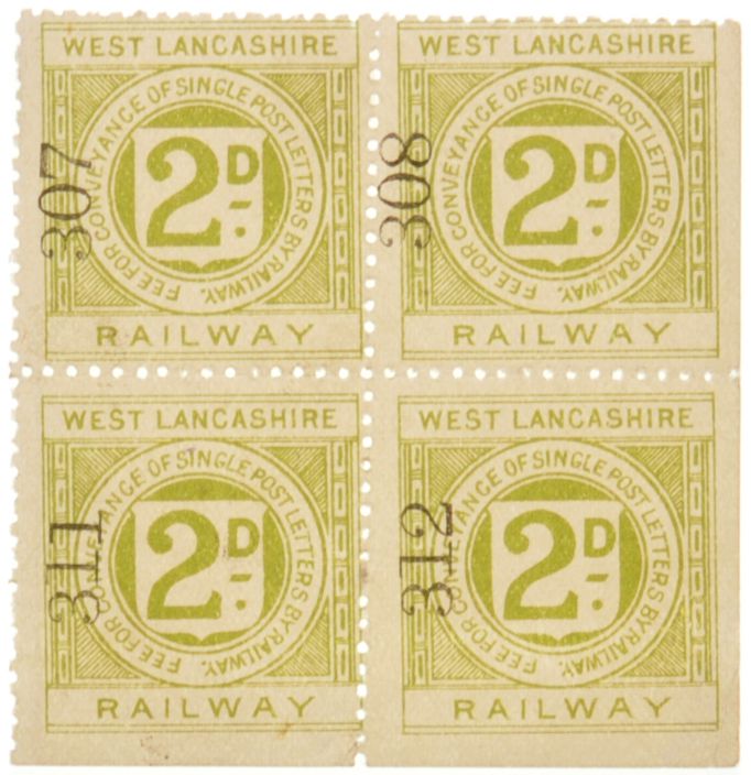 Category: Parcel and Letter StampsWest Lancashire Railway, block of four 2d letter stamps, as issued to Banks Station. | |