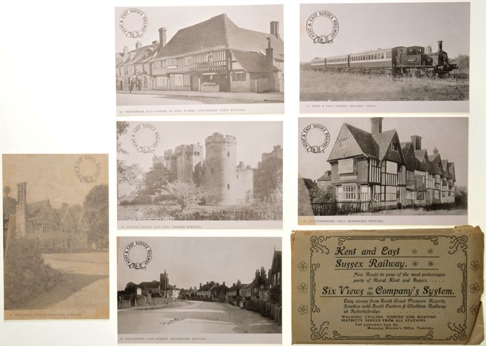 | Lot 1513 | Category: PostcardsKent and East Sussex Railway, six views on the company's system, in original envelope, Brickwell House, Bodiam Castle, Rolvenden High Street, Tenterdon, K&ES Train, Clothworkers Hall. Cards, excellent, a little wear to the edge of the envelope. |
