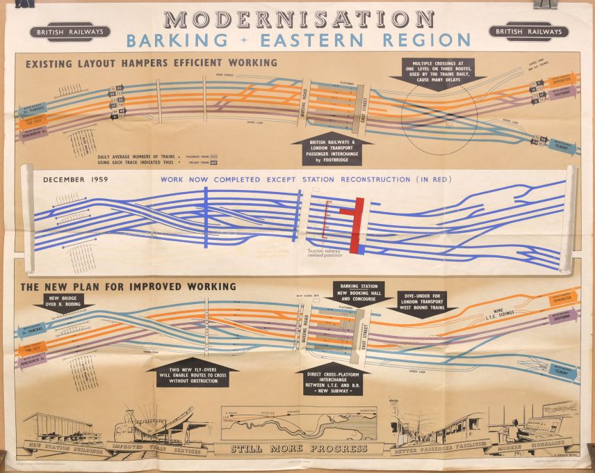 | Lot 1602 | Category: PostersBR(E), q/r, Modernisation Barking Eastern Region, layout of old and new facilities and artwork by F Donald Blake. |