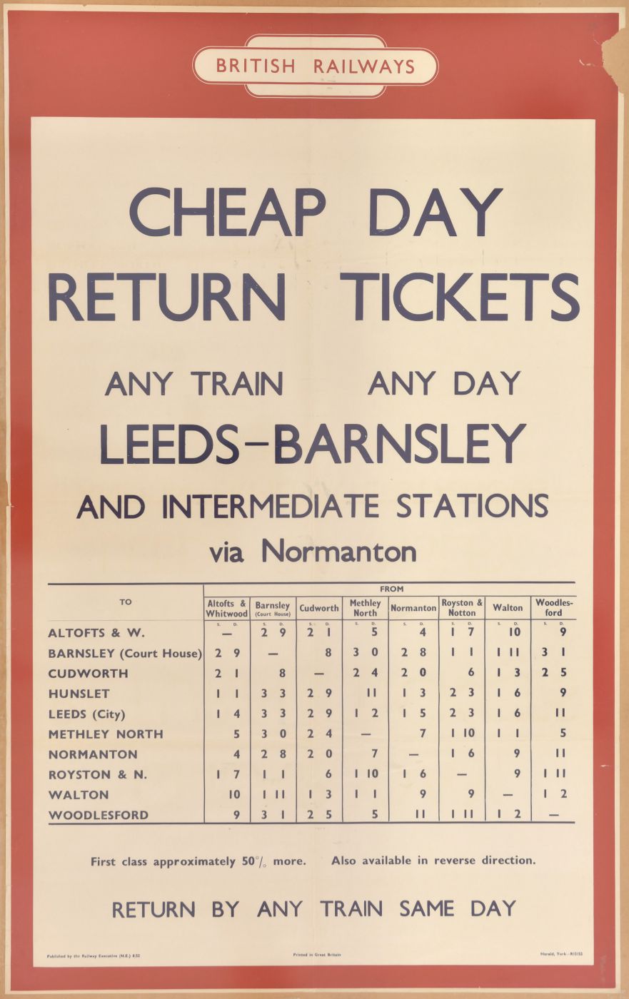 Category: PostersBR(NE), d/r, Cheap Fares, York-Harrogate Stations, Leeds-Selby, Barnesley-Normanton Area, Ilkley-Leeds-Nairsborough Area, all 1952. (4) | |