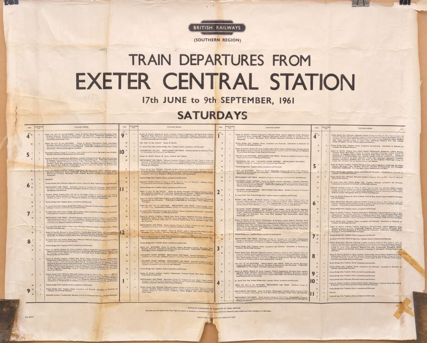 | Lot 1608 | Category: PostersBR(S), q/r, Exeter Central Train Departures Summer 1961, includes Atlantic Coast Express service and numerous restaurant cars, damage and loss centre base, text unaffected, edge repairs. |