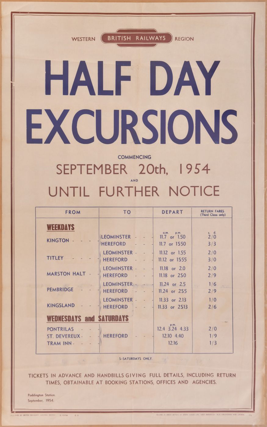 Category: PostersBR(W), d/r, Excursions, Kington, Titley, Marston Halt, Pembridge, Kingsland, Pontrilas, St Devereux and Tram Inn, 1954. | |
