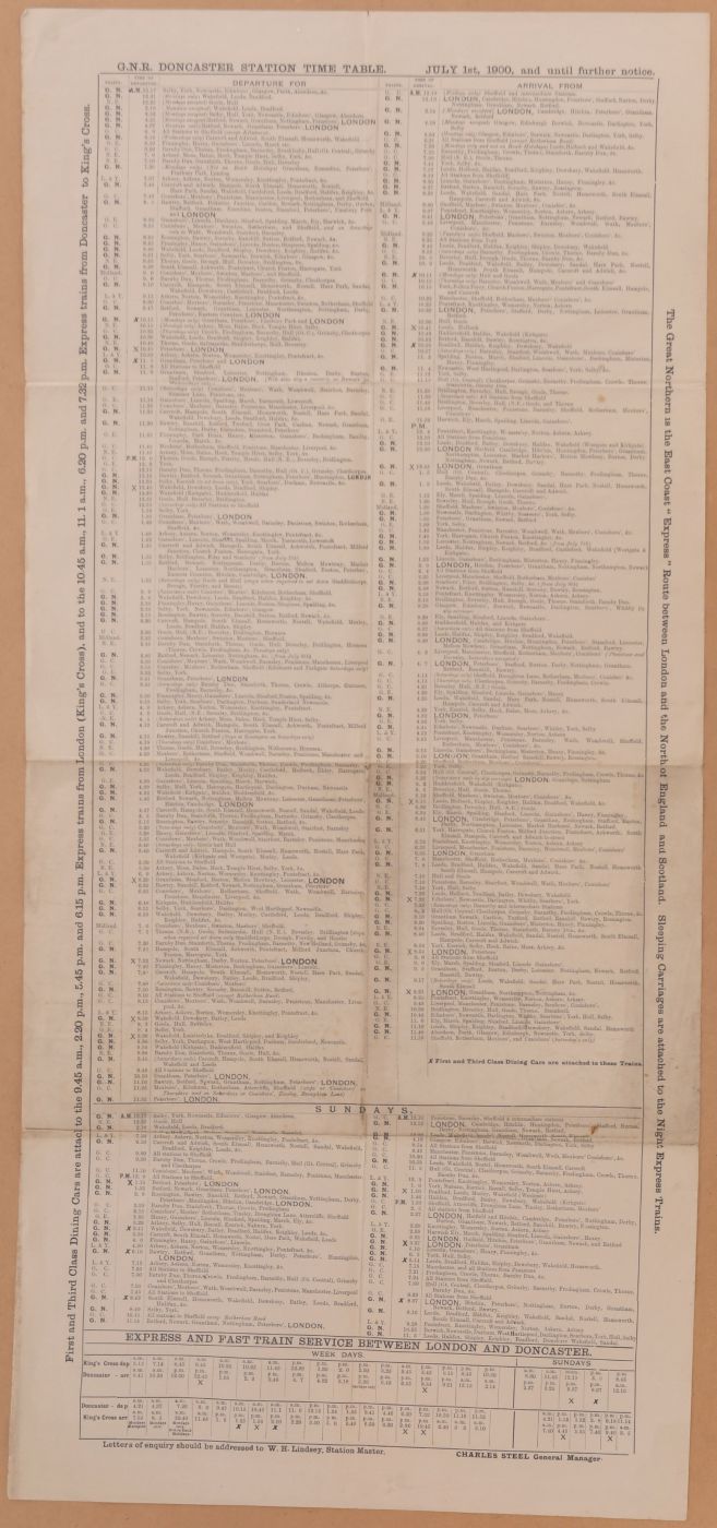 Category: PostersGNR, Doncaster Station Timetable, 1st July 1900, listing departures by time, folded, approximately 16"x35". £15 | |