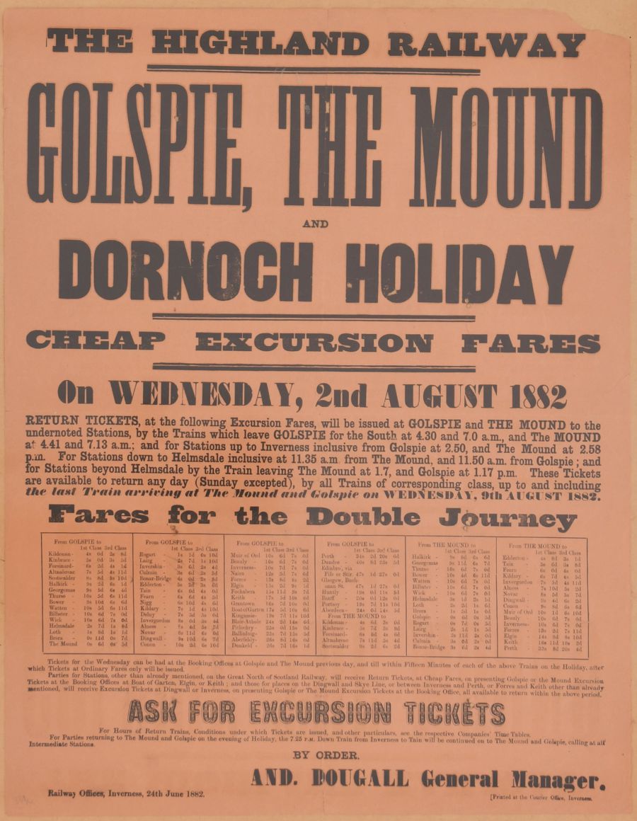 Category: PostersHighland Railway, smaller than d/r, Golspie, The Mound And Dornach Holiday Cheap Fares 1882, a little wear and repair at fold. | |