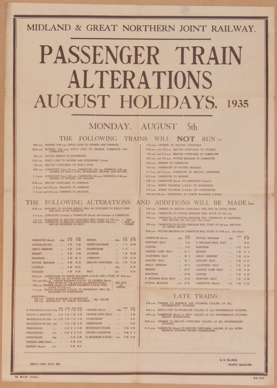 Category: PostersM&GN, Passenger Train Alterations, August Holidays 1935, approximately 20"x28", folded. | |