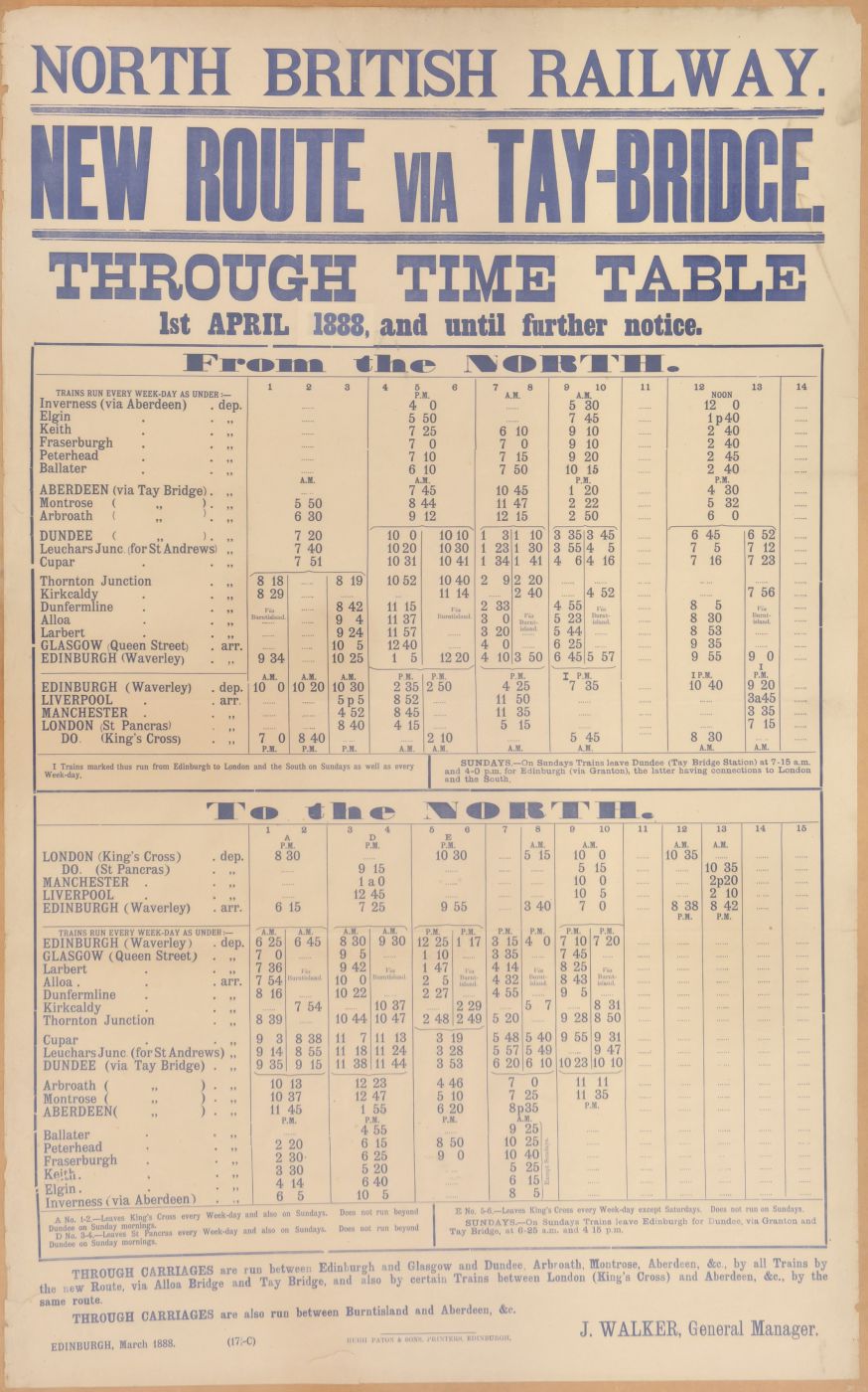 Category: PostersNBR, d/r, New Route Via Tay Bridge, Through Timetable April 1888, a small repair at the bottom border. | |